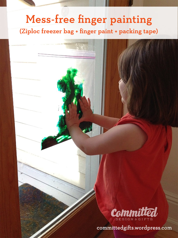 I found this brilliance on Pinterest, and couldn’t wait to try it. I could only find one color of finger paint, so I added a few drops of blue food coloring for interest. I think it helped thin out the paint so it would squish and swirl more. Just add a few blobs of finger paint to a gallon-size freezer bag, squeeze out the air, seal, and tape all edges to a window. I say tape all the edges because as the kiddos get older, they like to peel, pull, and basically destroy everything they get their hands on! We did get a hole in ours, but patched with more packing tape and it was fine. We had fun stamping footprints, handprints, and even stamping shapes with some of our Melissa & Doug play dough tools.