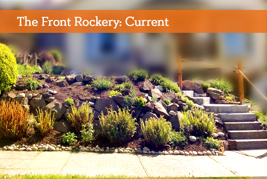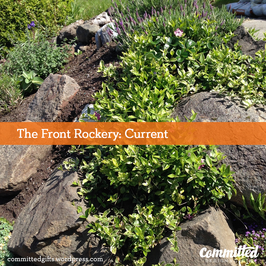 So I took her advice. This was last fall. What bugged me most was the rockery flanking our driveway and along the sidewalk. It was a mess, but had great potential. I did a lot of Pinterest searching and took some of the consultant’s advice to stick in varieties of thyme (edible, great ground cover, spreads well, and keeps a low profile). It took about 2 weeks of a few hours every few days, but it was done!