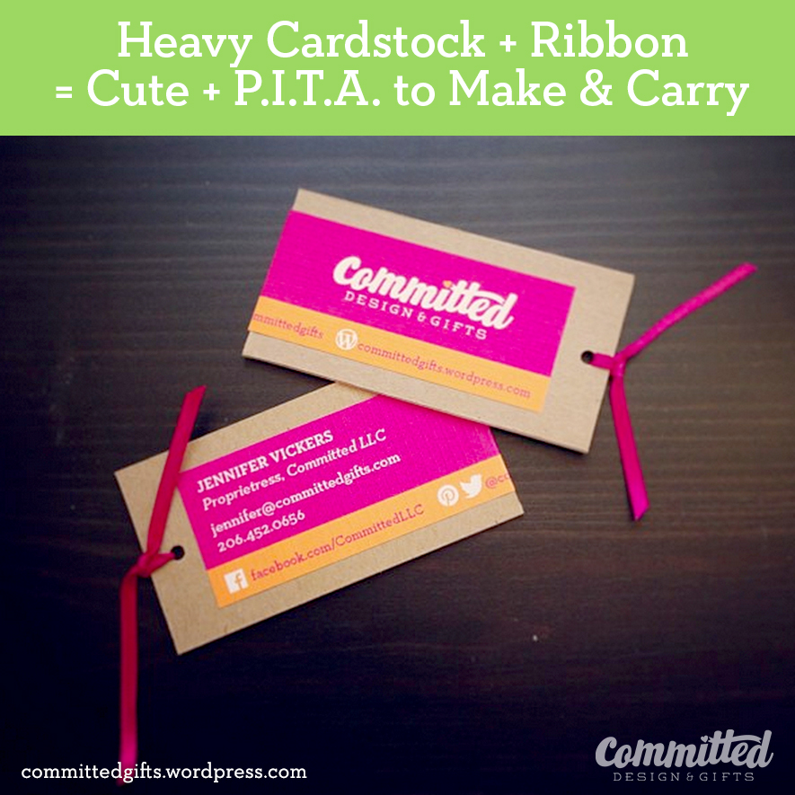 I had a bunch of pulpboard lying around, and figured, hey, let’s use it! So I went bolder with the colors, and added a ribbon, since hey, it’s cute, and my domain name is Committed GIFTS. Gift tag, get it?