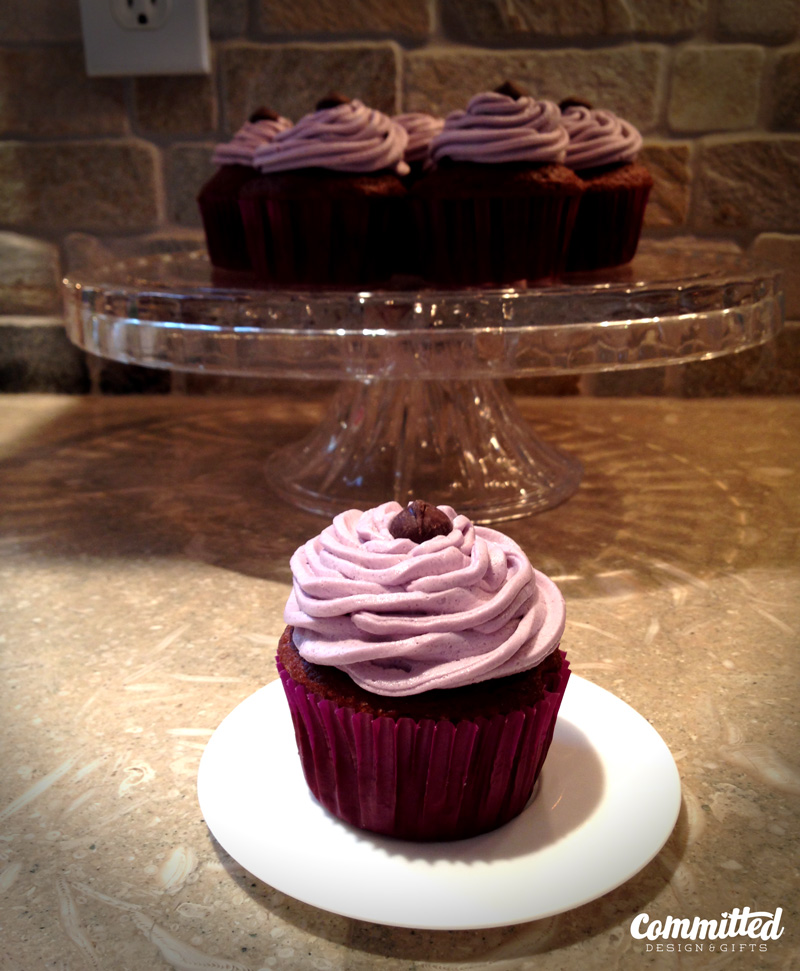 I used this recipe from Martha Stewart. I halved the recipe for one box-worth of cupcakes, but kept the full amount of vanilla. I added in food coloring to get the purple color. And voila!